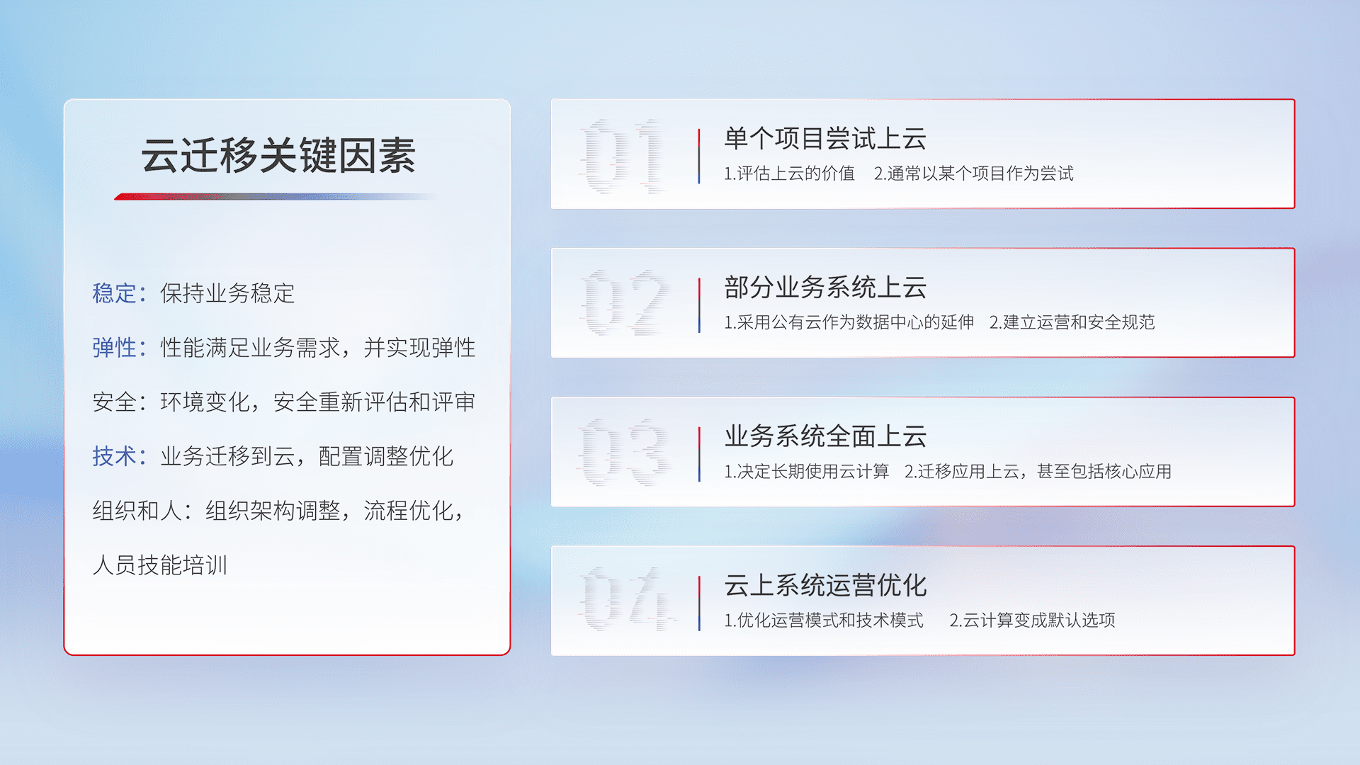 结合实际业务,,,,从规划设计、、、、云平台选型、、、、云原生改造、、、、数据迁移、、集成交付,,,,迁移全过程为客户识别最佳上云路径,,,,做好风险识别管理,,,设计网络架构、、、身份权限、、、、安全审计合规、、、、操作审计、、、、日志审计、、、、监控告警策略、、、多站点容灾设计等,,,对云上基础设施进行整体规划,,,,提升IT治理水平,,,,以满足弹性、、、高可用、、、高性能的需求。。