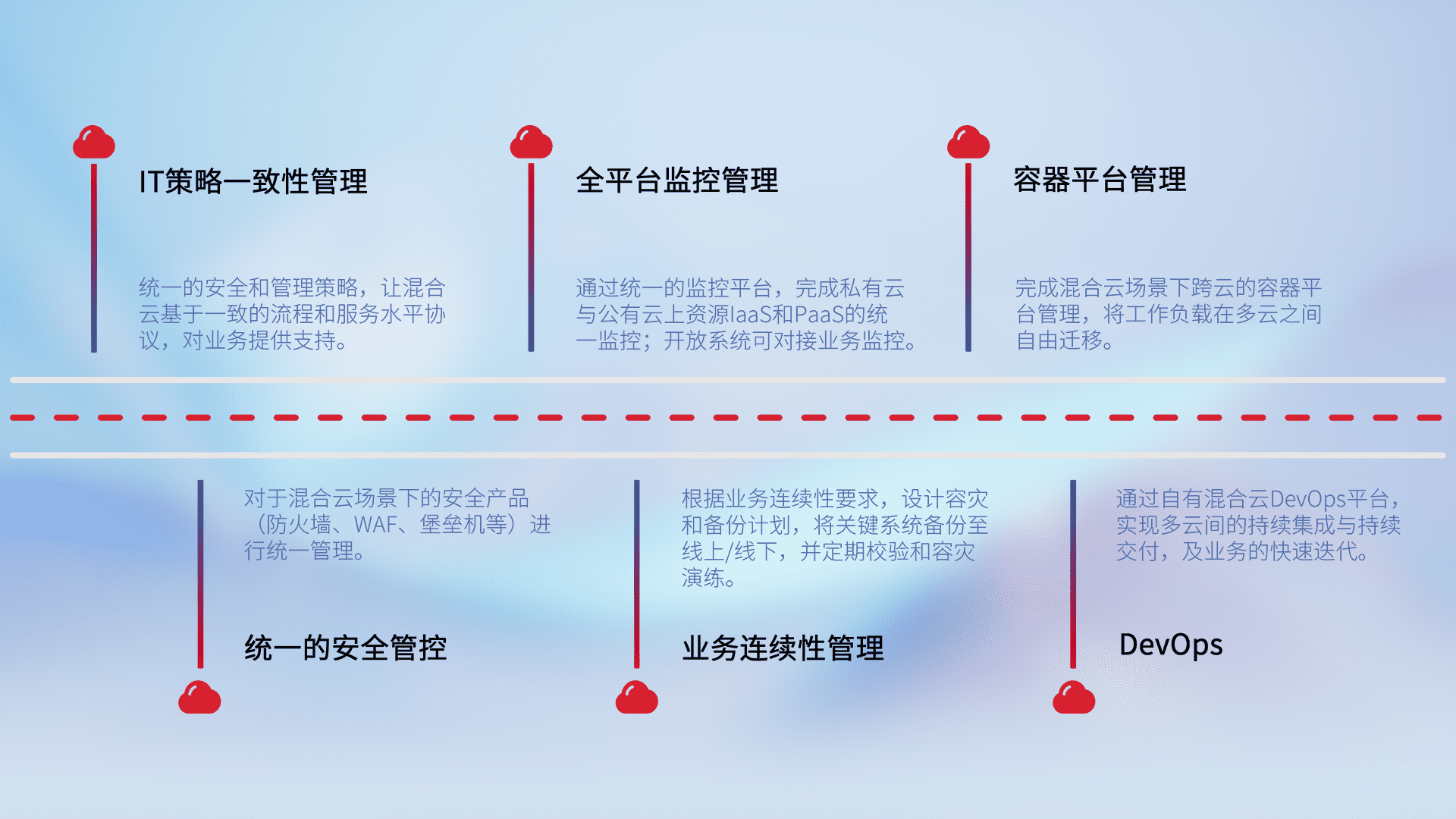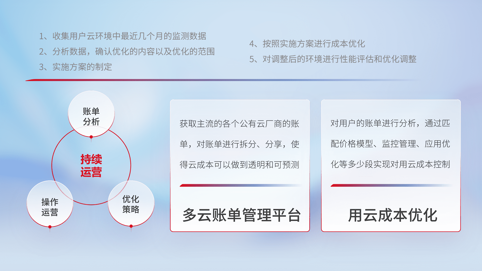 通过多云纳管,,,以统一的资源数据模型把客户的云资源进行抽象和封装,,,,进而实现对多云资源的统一操作,,,,保障云资源管理的可靠性、、稳定性与可用性。。量身定制化运维内容,,,配置、、开发运维、、补丁管理、、、、备份、、、、监控、、、、认证和访问管理、、审计和日常巡检等,,,,保障在用云过程中的可靠度,,稳定度以及高可用率。。